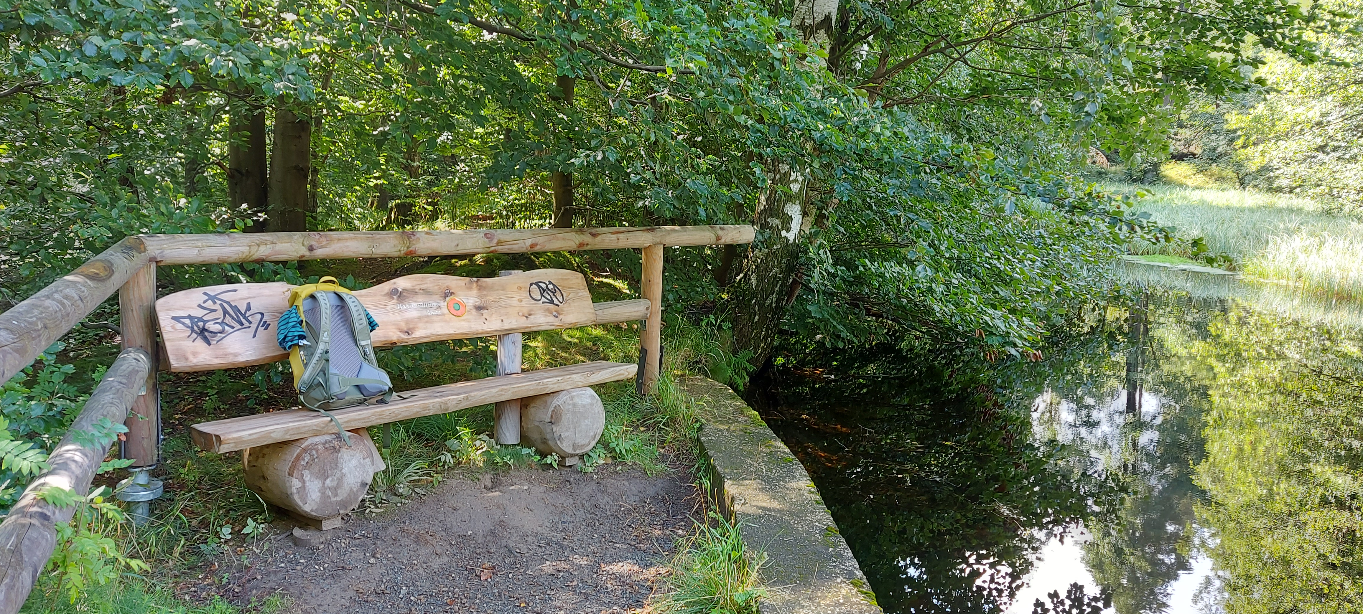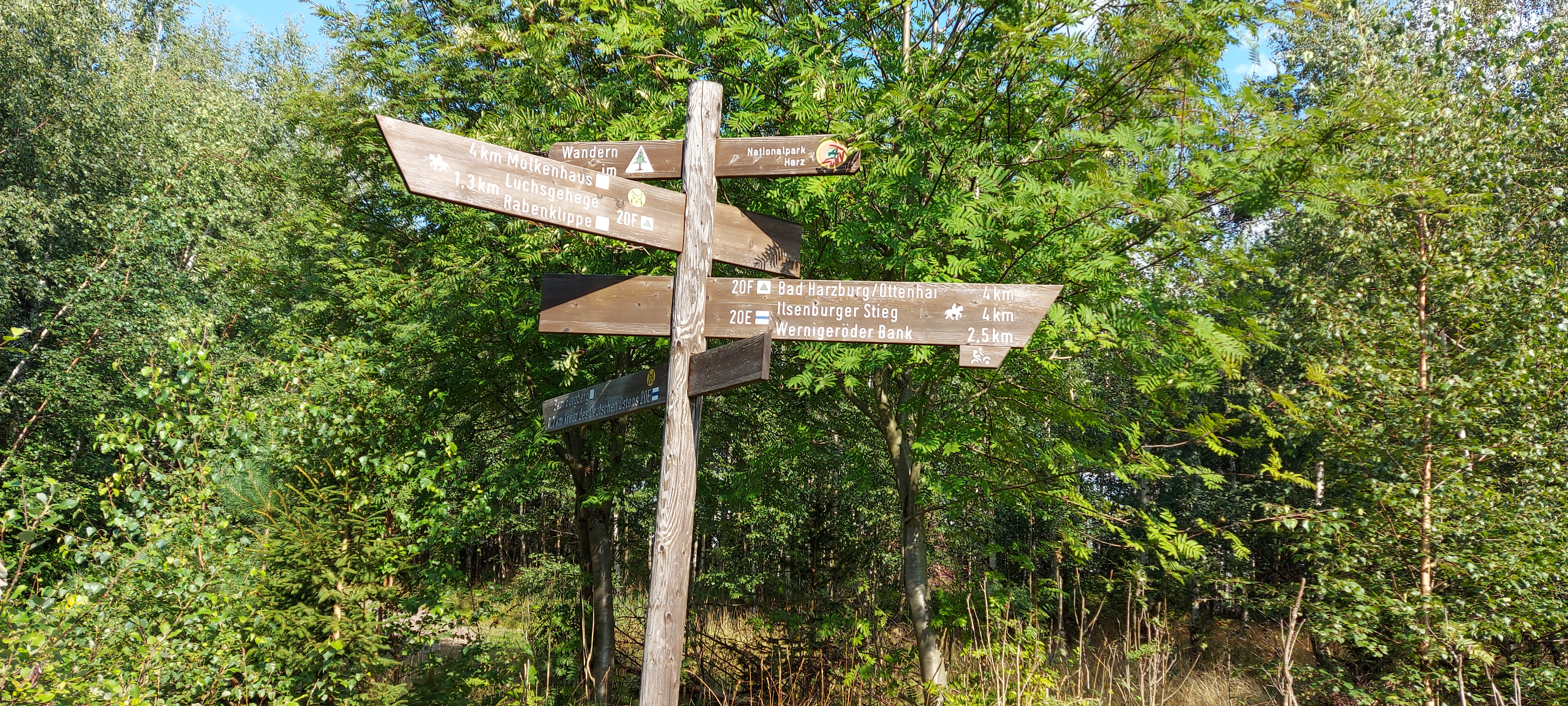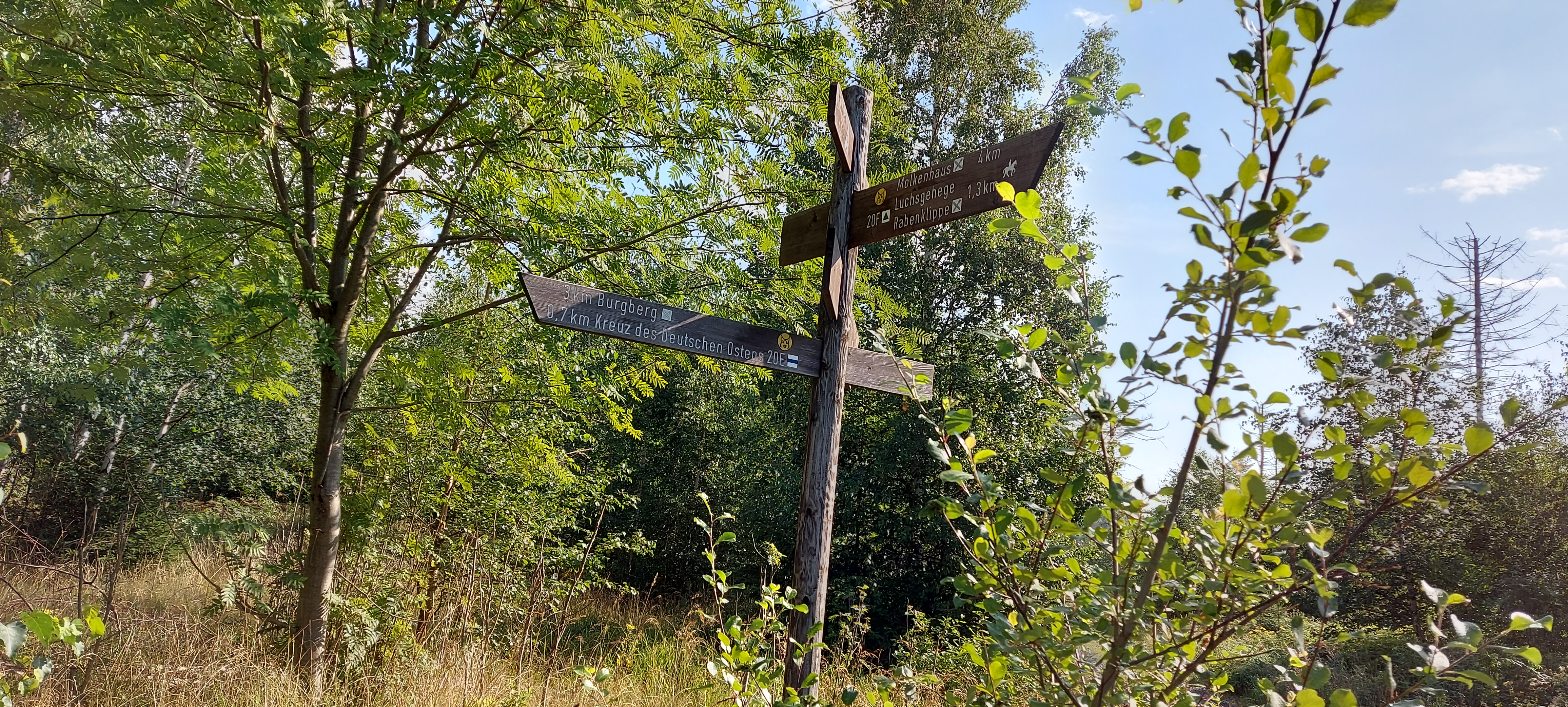 Bis zum Kreuz des Ostens sind wir dann gemeinsam gegangen, nette Unterhaltung inklusive. Vom Kreuz aus bin ich dann allein weiter zur Rabenklippe und den Luchsen. Da war meine zeitweilige Wanderbegleitung gerade gestern gewesen. An der Rabenklippe war im Gasthaus eine junge Frau noch am Durchwischen vor dem Gästeansturm. Es war erst kurz vor 10 Uhr, als ich dort meinen Stempel abholte. Aber ein Eis konnte ich schon bekommen. Auf die Frage, wo es denn weiter zur Rabenklippe weiterging, wurde mir der Weg durchs Haus gezeigt. Natürlich war mir als Hausfrau, die Wischen zu würdigen weiß, es peinlich, jetzt da durchs „frisch Gewischte“ zu watzeln. Aber das brachte nur ein Schulterzucken.