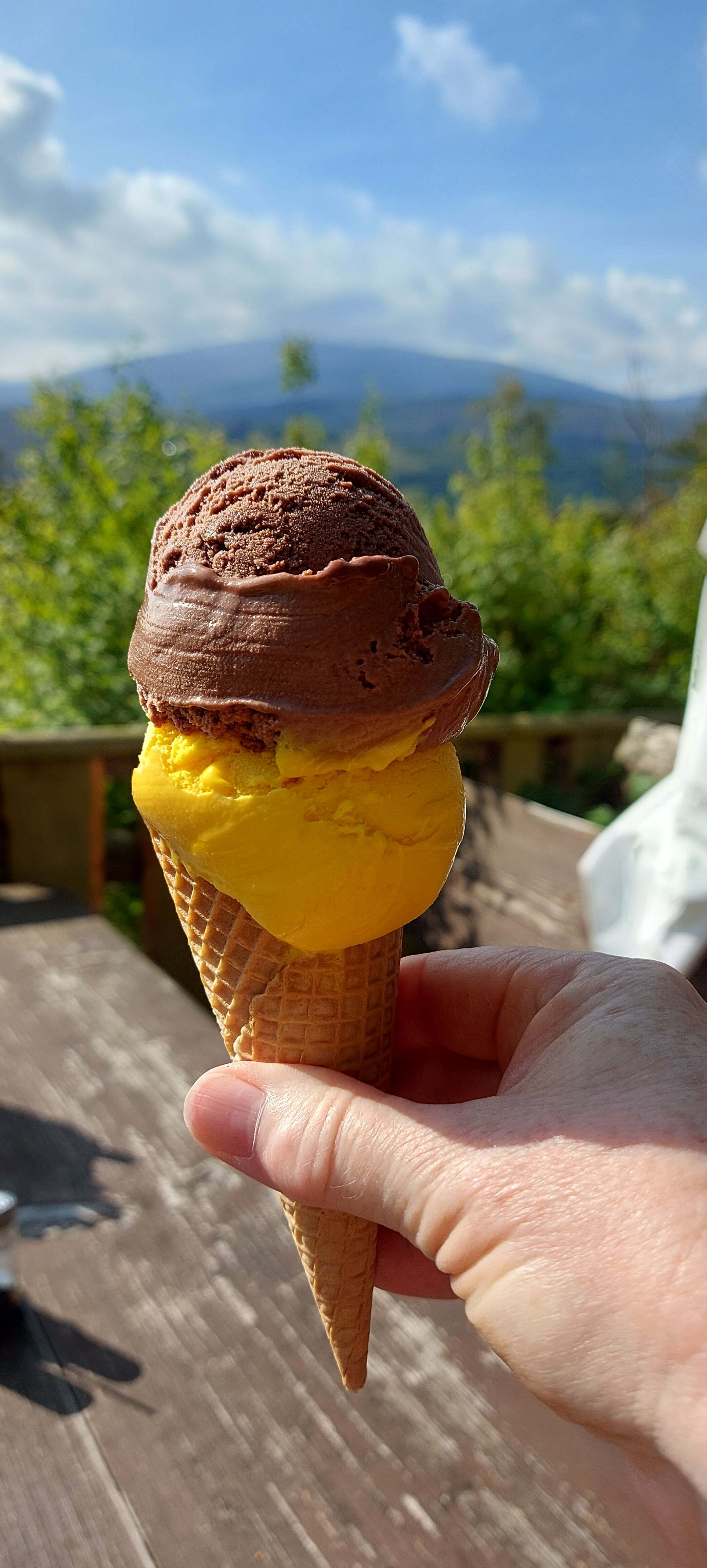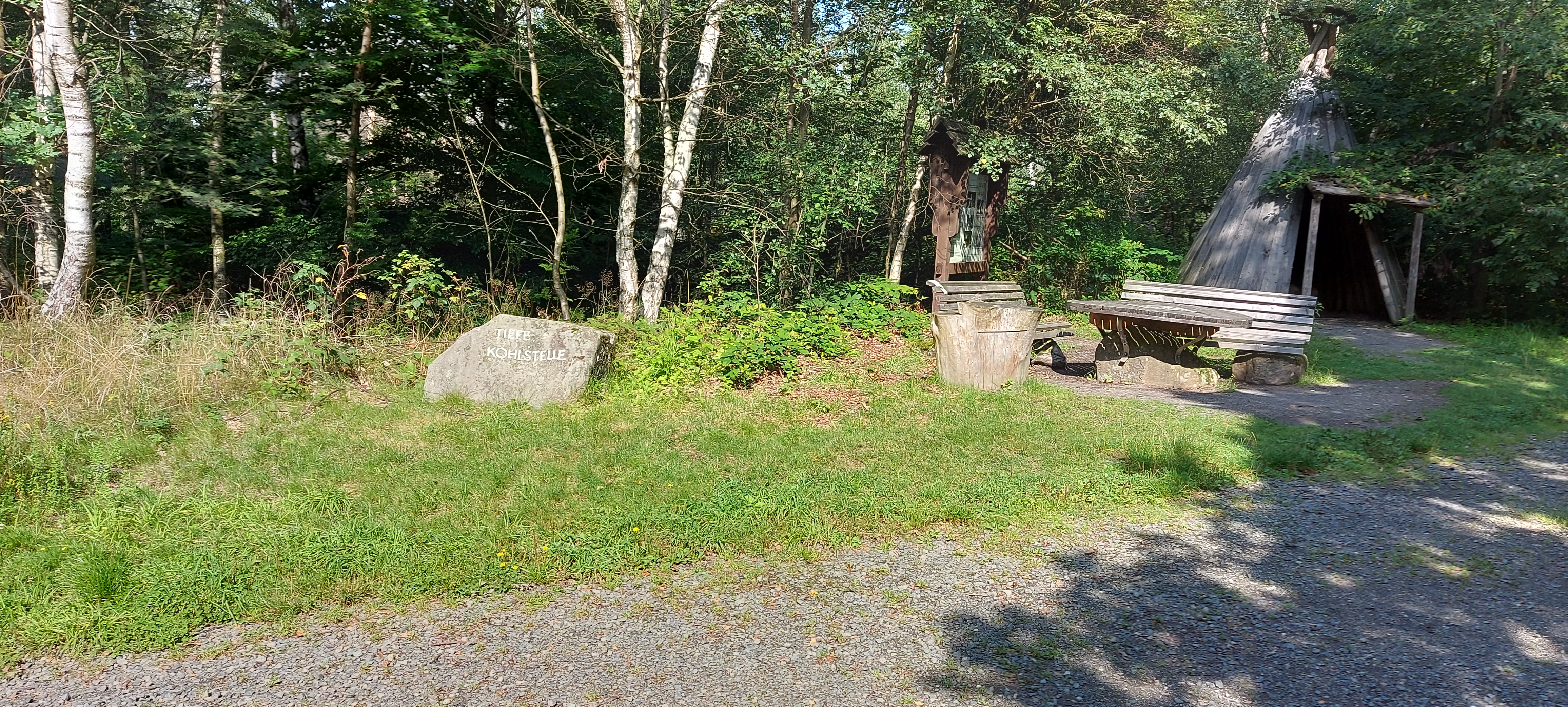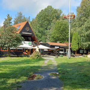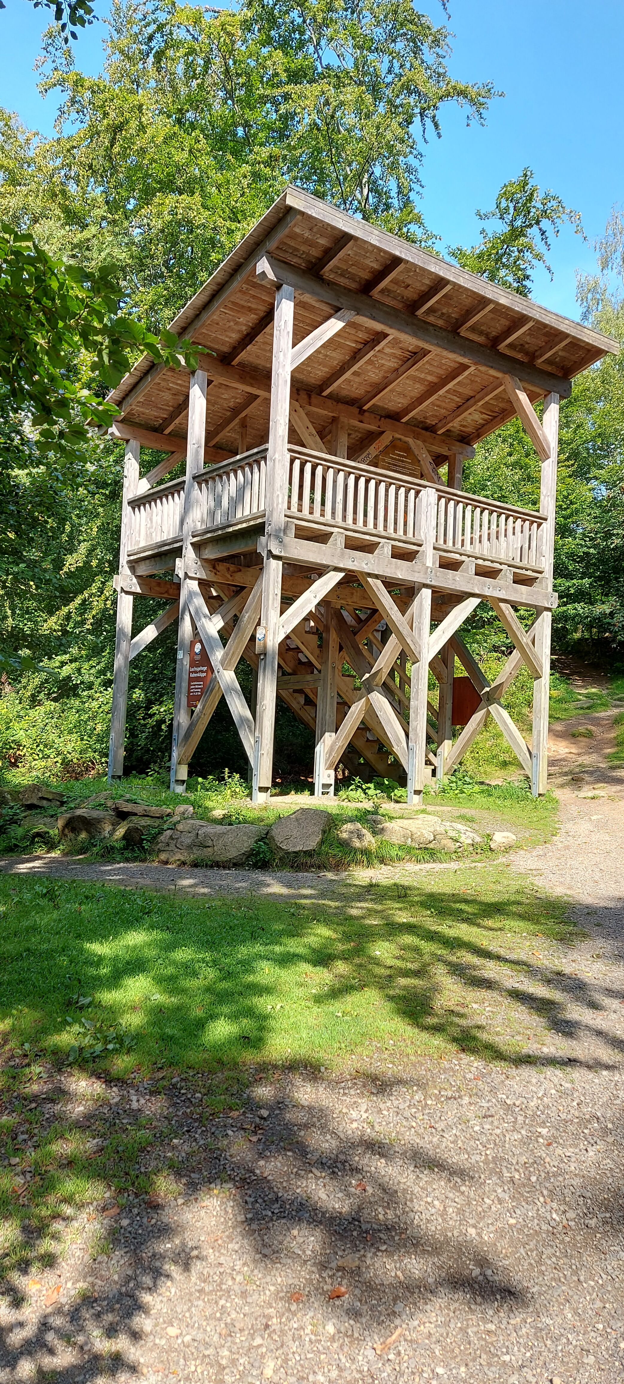 Bis zum Kreuz des Ostens sind wir dann gemeinsam gegangen, nette Unterhaltung inklusive. Vom Kreuz aus bin ich dann allein weiter zur Rabenklippe und den Luchsen. Da war meine zeitweilige Wanderbegleitung gerade gestern gewesen. An der Rabenklippe war im Gasthaus eine junge Frau noch am Durchwischen vor dem Gästeansturm. Es war erst kurz vor 10 Uhr, als ich dort meinen Stempel abholte. Aber ein Eis konnte ich schon bekommen. Auf die Frage, wo es denn weiter zur Rabenklippe weiterging, wurde mir der Weg durchs Haus gezeigt. Natürlich war mir als Hausfrau, die Wischen zu würdigen weiß, es peinlich, jetzt da durchs „frisch Gewischte“ zu watzeln. Aber das brachte nur ein Schulterzucken.