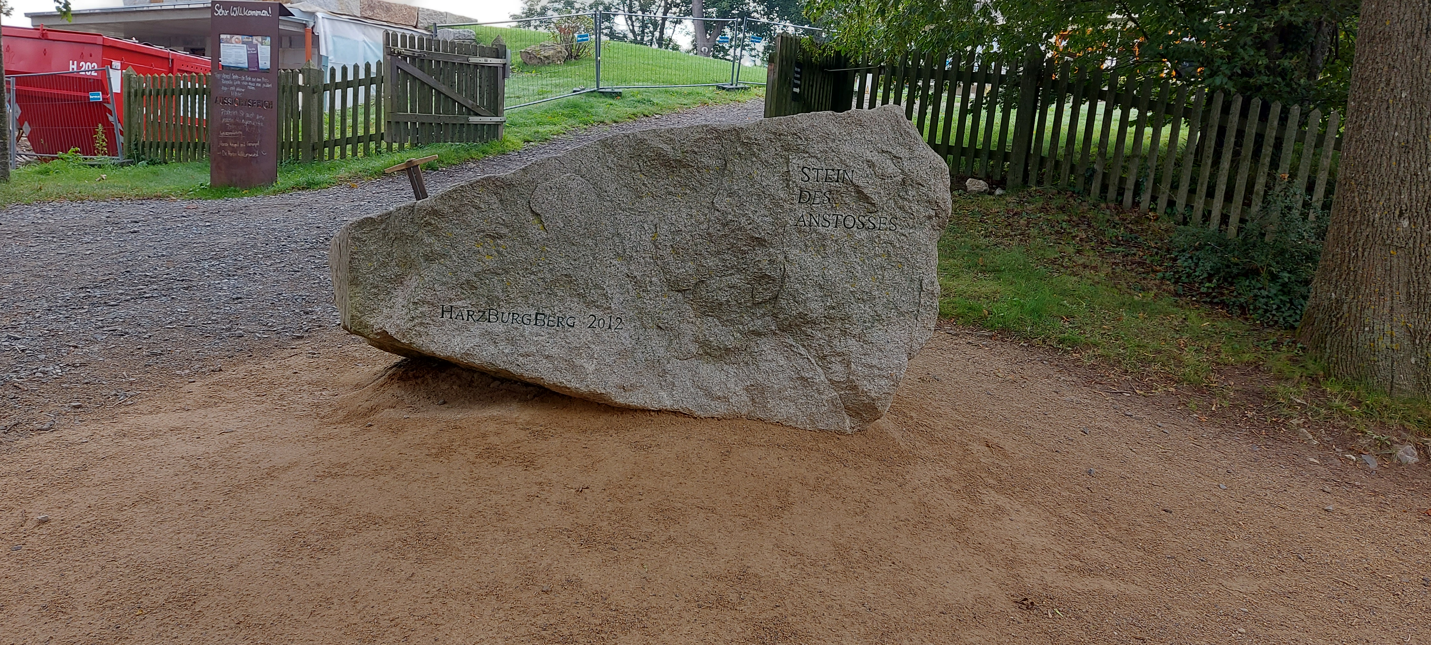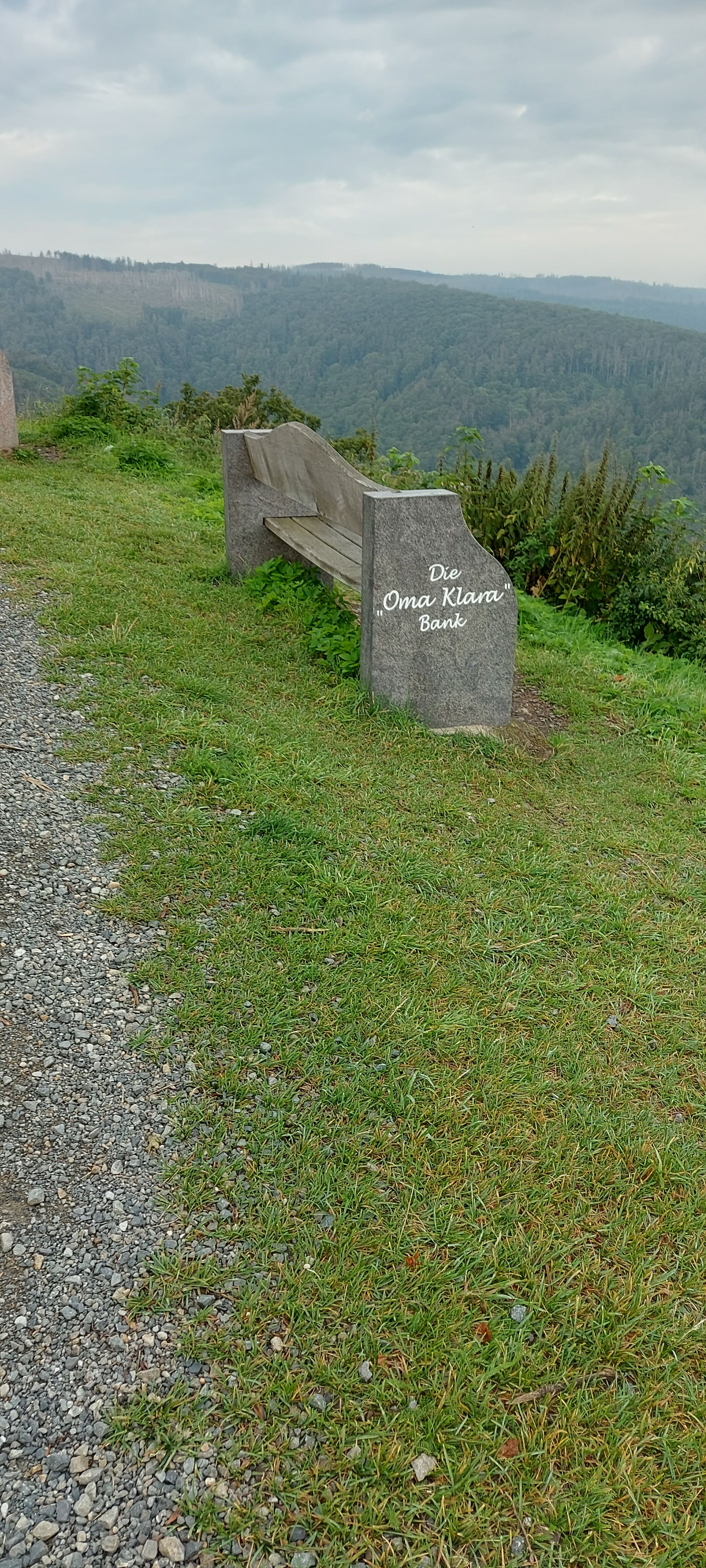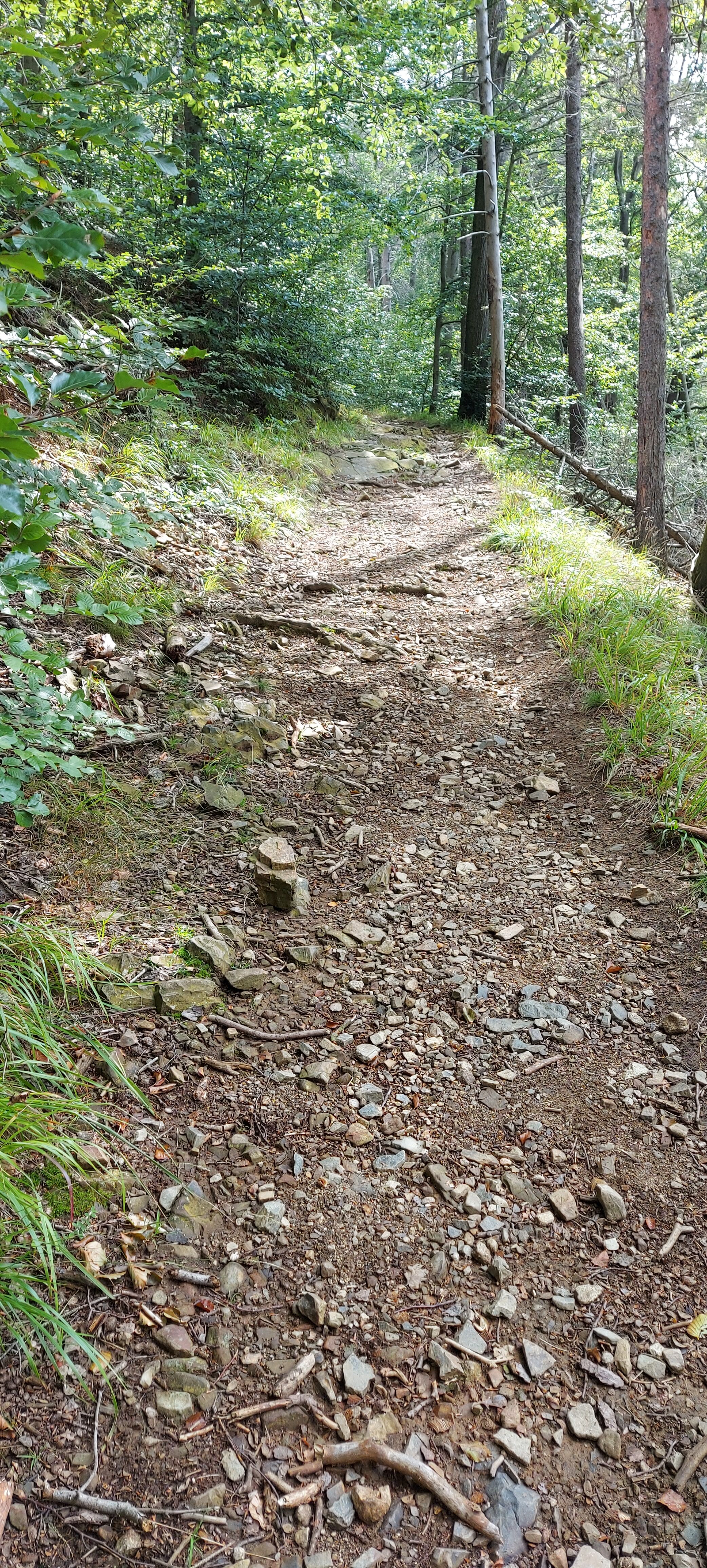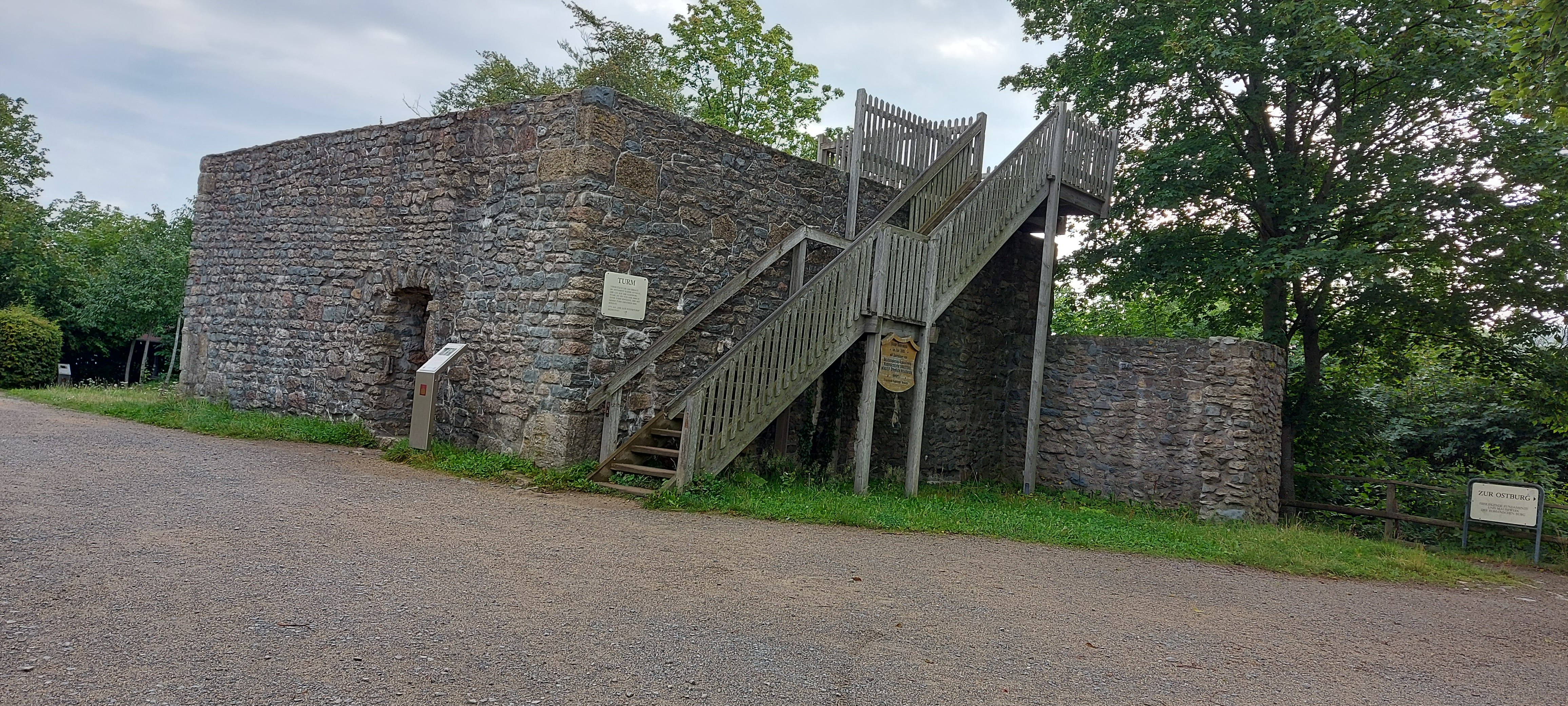 Ok, die geplante Tour sollte auf dem Burgberg an der Stempelstelle beginnen. Rauf kommt man mit der Seilbahn, wenn sie denn schon fahren würde. Na ja, man kann ja auch um den Berg rum und dann von der Seite auf den Weg zuhalten. Nach Navi geht das. Und Kaiserweg hört sich doch gemütlich an. War er aber nicht. Er ging steil bergauf. Wozu nochmal hatte ich ein frisches TShirt angezogen? Nach einer halben (wohl eher doch viertel) Stunde war ich verschwitzt, wie gestern nach der gesamten Wanderung. Aber Aufgeben ist keine Lösung und sooo weit ist ja nicht! Irgendwann sagte das Schild kleiner Burgberg 0,3km und großer Burgberg 0,4km. Das kann man schaffen!!! Ursprünglich gedacht, den Stempel links (bzw. rechts) liegen zu lassen, wollte ich ihn nun aber auch haben. Und ich war nicht die einzige Verrückte an diesem Morgen. Noch jemand hatte diese „Ochsentour“ hinter sich gebracht. Ein Einheimischer, ca. 20 Jahre jünger schnaufte genauso, wie ich.